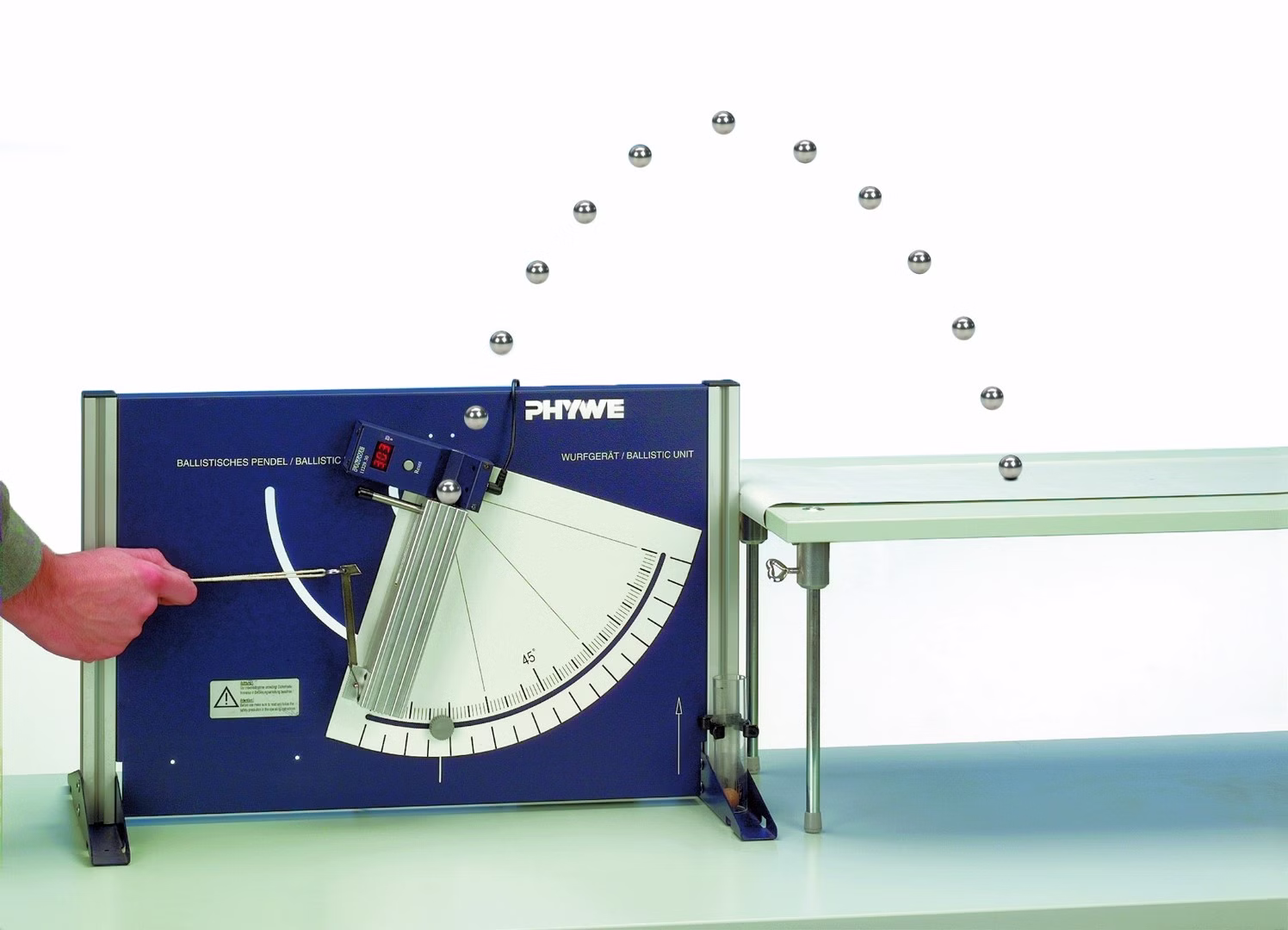 Eine Stahlkugel wird durch eine Feder mit verschiedenen Geschwindigkeiten und unter verschiedenen Winkeln zur Horizontalen abgefeuert. Die Beziehungen zwischen der Strecke, der Höhe der Projektion, dem Neigungswinkel und der Beschleunigung können bestimmt werden.