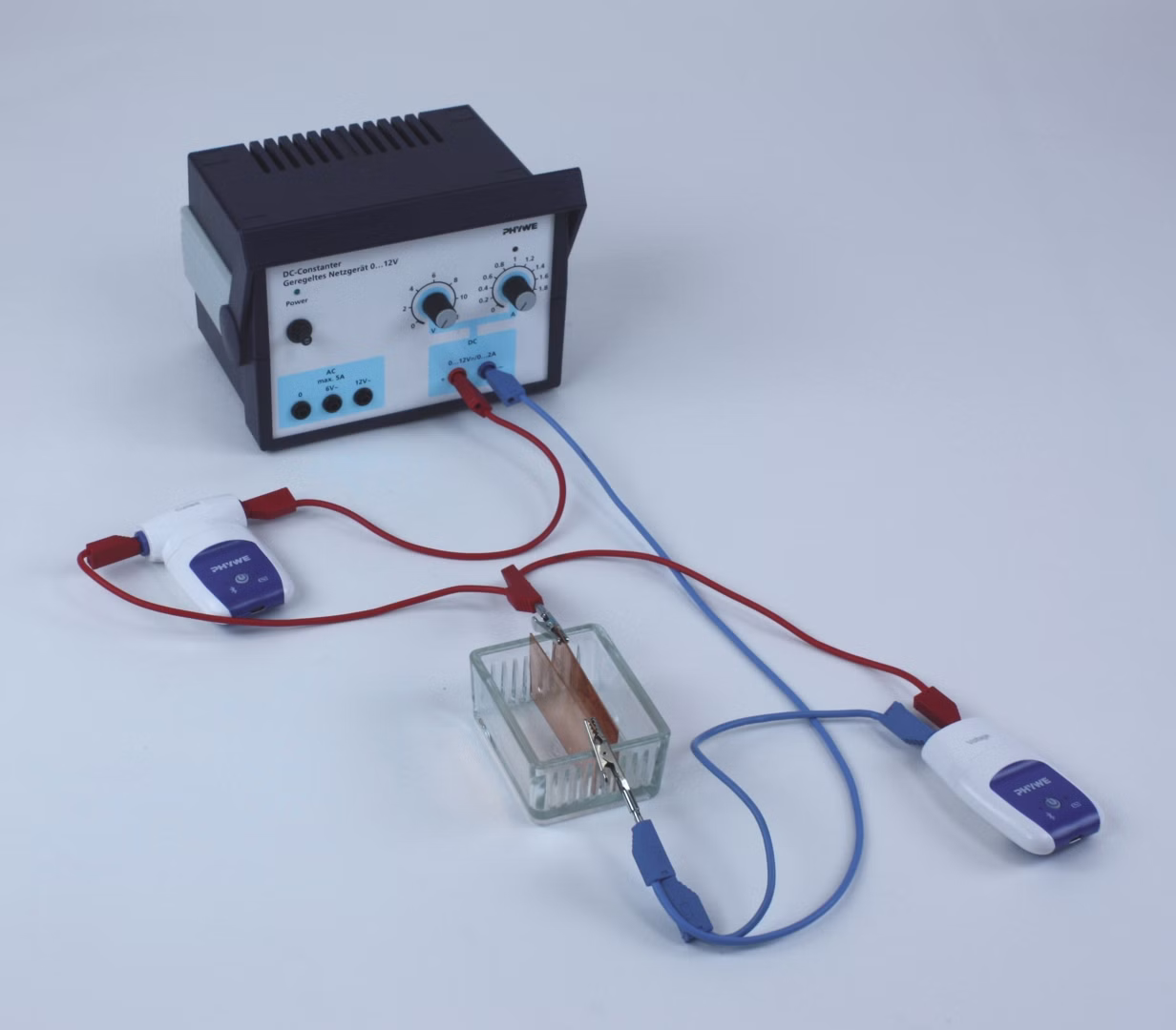 Messe die Strom-Spannungs-Kennlinie eines Elektrolysebades mit Kupfersulfatlösung und Kupferelektroden. Beobachte sichtbare elektrochemische Veränderungen der Elektroden und des Bades.