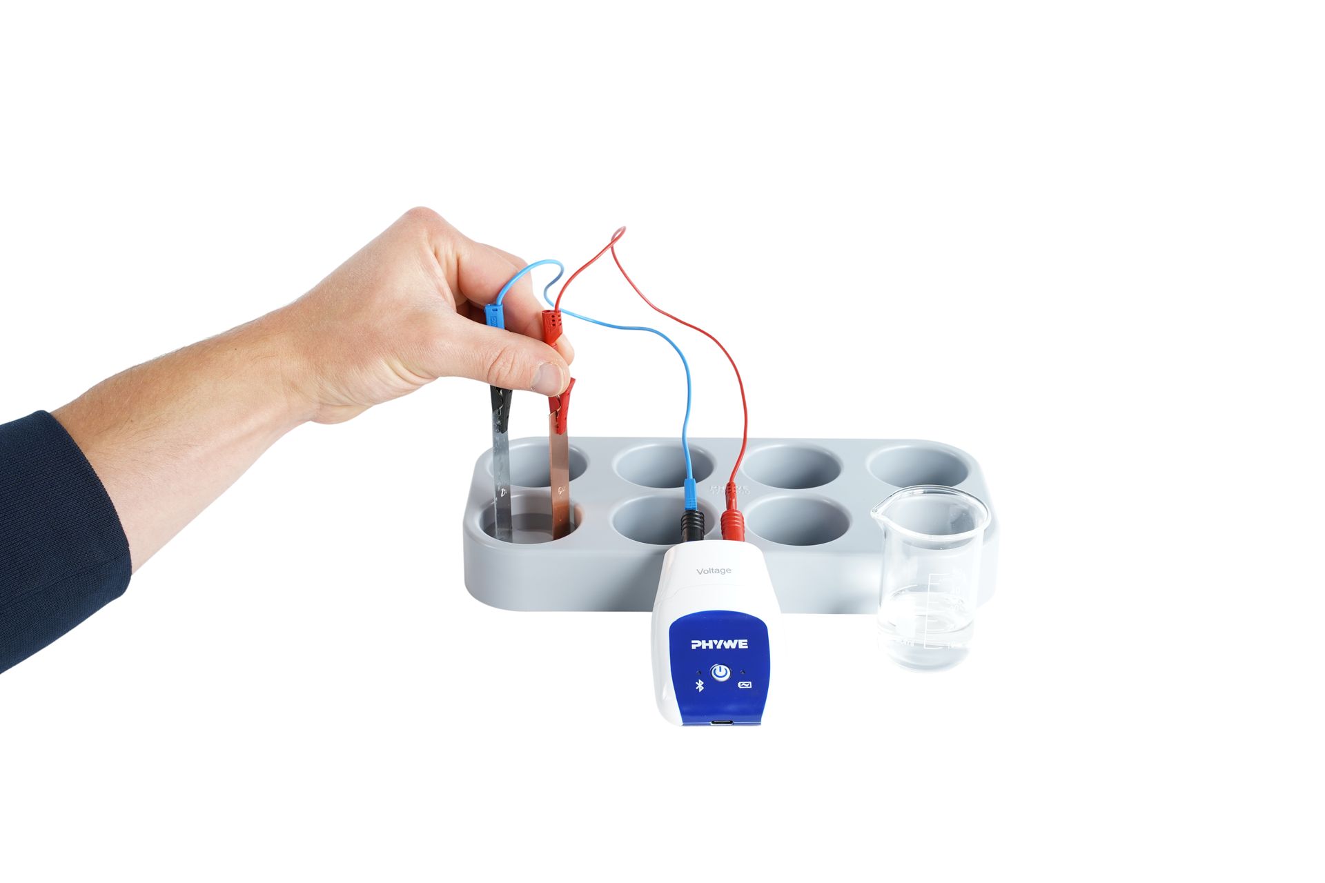 Taucht man ein Kupfer- und ein Zinkblech in eine Salzlösung ein, kann man zwischen diesen Blechen eine elektrische Gleichspannung messen. In dieser Salzlösung gibt das unedlere Metall (hier Zink) Elektronen an das edlere Metall (hier Kupfer) ab. Die verwendeten Metalle fungieren als sogenannte Elektroden. In diesem Versuch lernen Schüler daher, wie man eine Gleichspannung in einer Salzlösung durch zwei Elektroden erzeugen und diese mit dem Cobra SMARTsense Spannungs-Sensor und der PHYWE measureAPP einfach messen kann.