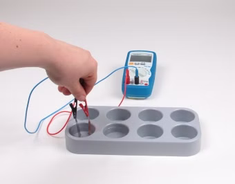 Taucht man ein Kupfer- und ein Zinkblech in eine Salzlösung ein, kann man zwischen diesen Blechen eine elektrische Gleichspannung messen. In dieser Salzlösung gibt das unedlere Metall (hier: Zink) Elektronen an das edlere Metall (hier: Kupfer) ab. Die verwendeten Metalle (bzw. Metalldrähte) fungieren als sogenannte Elektroden. In diesem Versuch lernen Schüler daher, wie man Gleichspannung in einer Salzlösung durch zwei Elektroden erzeugen kann
