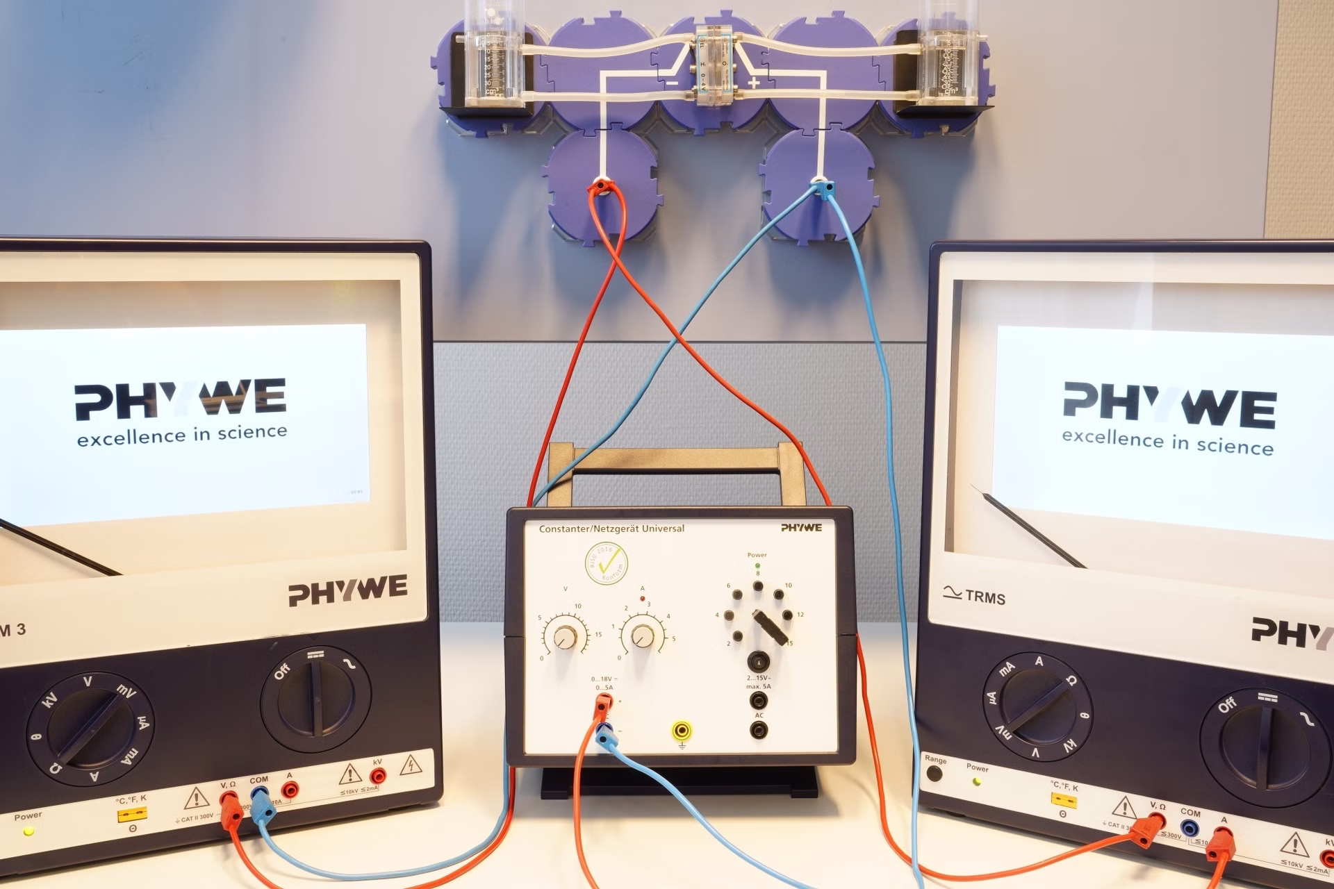 Mit Hilfe eines PEM Elektrolyseurs (proton exchange membrane) kann Wasser in Wasserstoff und Sauerstoff getrennt werden, ohne Laugen oder Säuren zu verwenden. In diesem Versuch wird zuerst ermittelt in welchem Verhältnis die beiden Gase entstehen. Im zweiten Versuchsteil wird die Kennlinie des PEM Elektrolyseurs ermittelt.