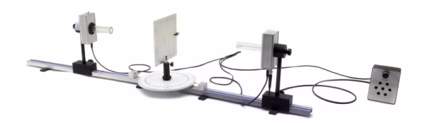 Praktisches Komplettset beinhaltet Betriebsgerät, Sender und Empfänger als Hornantennen, Mikrowellensonde, Mikrowellenbank mit Gelenk, Gitter, Reflektorplatte, Absorptionsplatte, Prisma, Doppelspaltplatte