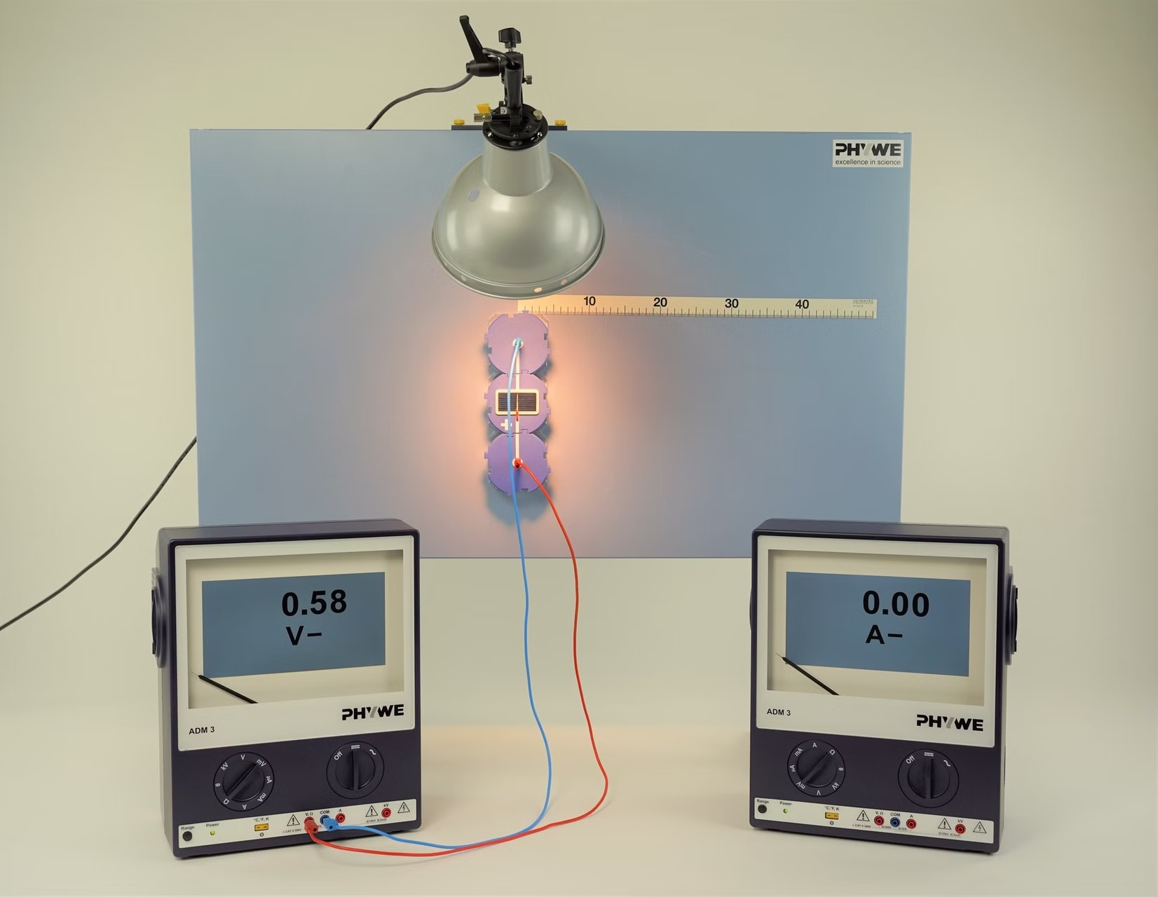 Solarzellen wandeln Sonnenenergie in elektrische Energie um. Die maximal erreichbare Spannung bzw. Stromstärke bestimmen ihre Anwendungsmöglichkeiten. Die maximale Spannung einer Solarzelle ist die Leerlaufspannung U0, bei der sich kein Widerstand im Stromkreis befindet (Widerstand = ∞). Die maximale Stromstärke ist die Kurzschlussstromstärke IK. Sie wird erreicht, wenn der Widerstand gleich Null ist, also nur ein Leitungsdraht ("Kurzschluss") im Stromkreis ist. Im Versuch werden zunächst Leerlauf-spannung und Kurzschlussstromstärke in Abhängigkeit von der beleuchteten Fläche einer Solarzelle untersucht. Anschließend wird die Solarzelle auf der Tafel verschoben um die Lichtintensität zu ändern und dann ebenfalls diese beiden Größen zu bestimmen.