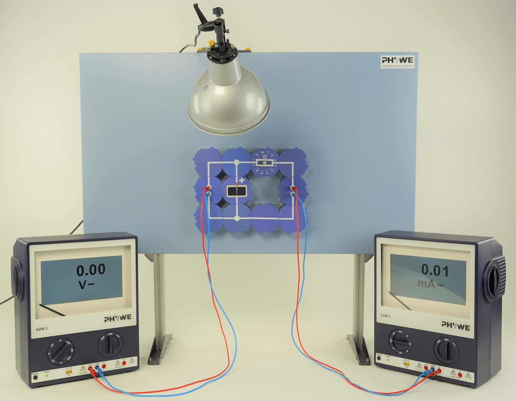 Die Strom-Spannungs-Kennlinie einer Solarzelle beschreibt ihr Verhalten bei Belastung. Die Ausgangleistung der Solarzelle ist maximal, wenn ihr Innenwiderstand so groß ist wie der äußere Widerstand. Zur Aufnahme der Kennlinie wird eine Widerstandsdekade an die Solarzelle angeschlossen. Sie besitzt 12 Schalterstellungen, mit verschiedenen Widerständen (auch Kurzschluss und offen), deren Werte so ausgewählt wurden, dass der Verlauf der Kennlinie gut dargestellt werden kann.